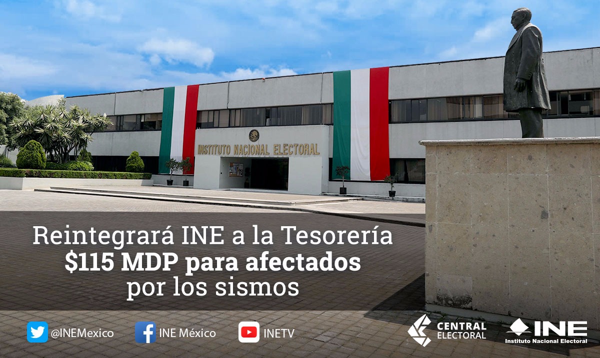 Ante la situación de emergencia que atraviesan varios estados a consecuencia de los recientes sismos, además de reintegrar 115 millones de pesos a la Secretaría de Hacienda y Crédito Público para que sean canalizados a la ayuda de personas damnificadas, el INE cederá tiempos en radio y televisión para la difusión de información sobre protección civil.