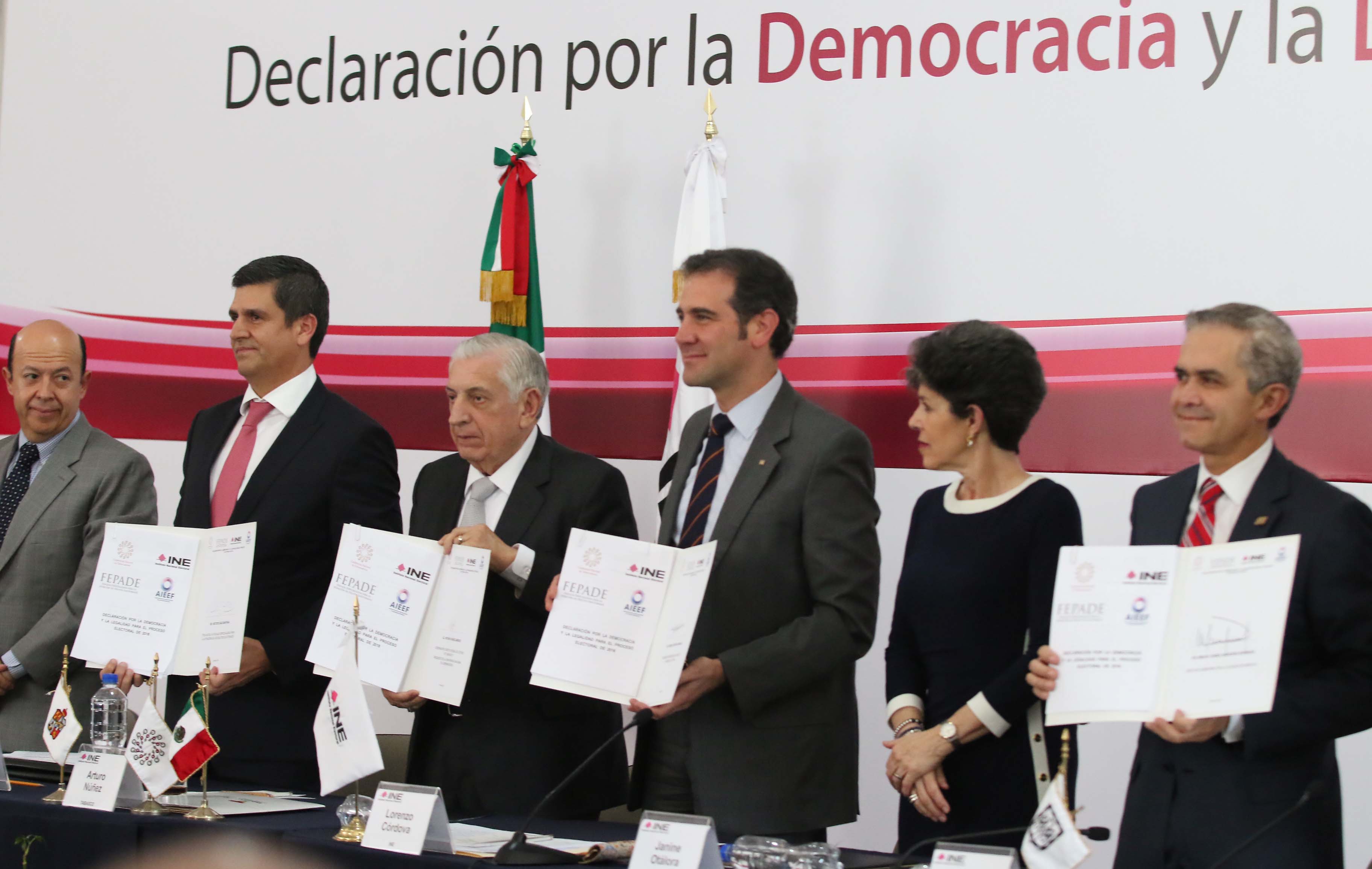 El Instituto Nacional Electoral (INE) y la Conferencia Nacional de Gobernadores (CONAGO), junto con autoridades electorales federales y estatales, firmaron hoy la Declaración por la Democracia y la Legalidad para el Proceso Electoral 2018, como un compromiso público para que las elecciones del 1 de julio, se realicen en paz, con legalidad, transparencia y al margen de influencias indebidas.
