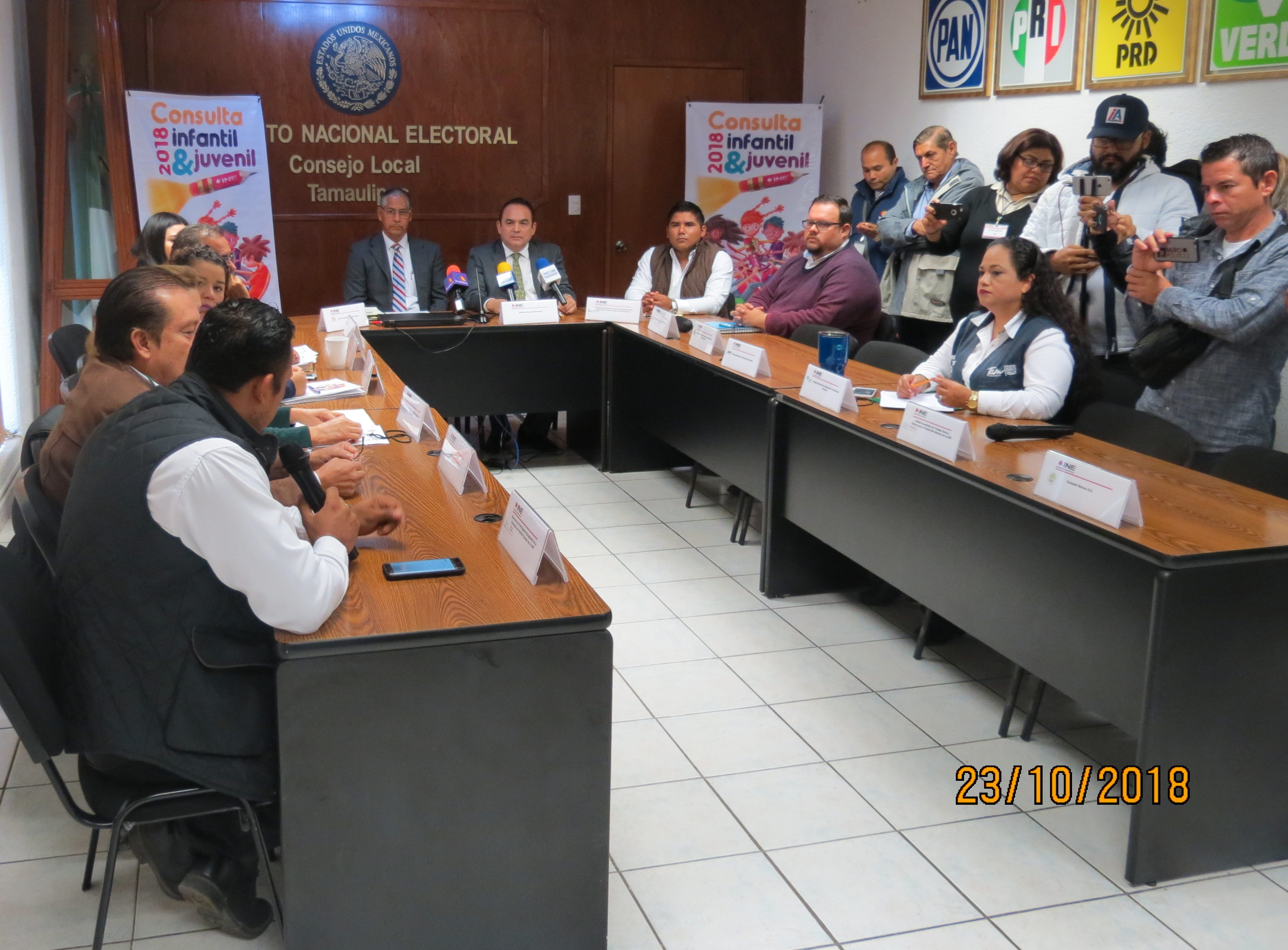 En conferencia de prensa celebrada el 23 de octubre de 2018, el Instituto Nacional Electoral en Tamaulipas, en coordinación con el Instituto Electoral de Tamaulipas, la Comisión de Derechos Humanos del Estado, el Sistema Estatal de Protección Integral de los Derechos de Niñas, Niños y Adolescentes, Creando Raíces A.C., la Secretaria de Educación del Estado, la Subsecretaría de Educación Básica de la SET, el Consejo Nacional de Fomento Educativo, el Sistema para el Desarrollo Integral de la Familia, el Instituto de la Juventud, el Colegio de Bachilleres del Estado, el Instituto Tamaulipeco de Capacitación para el Empleo, el Colegio Nacional de Educación Profesional Técnica, la Universidad Autónoma de Tamaulipas, la Dirección de Participación Estudiantil, de la Secretaria de Gestión Escolar de la UAT y la Unidad Académica de Trabajo Social y Ciencias para el Desarrollo Humano de la UAT, dieron a conocer los avances, compromisos y estrategias que serán prioritarios en la preparación de la Consulta Infantil y Juvenil 2018 en el estado de Tamaulipas.