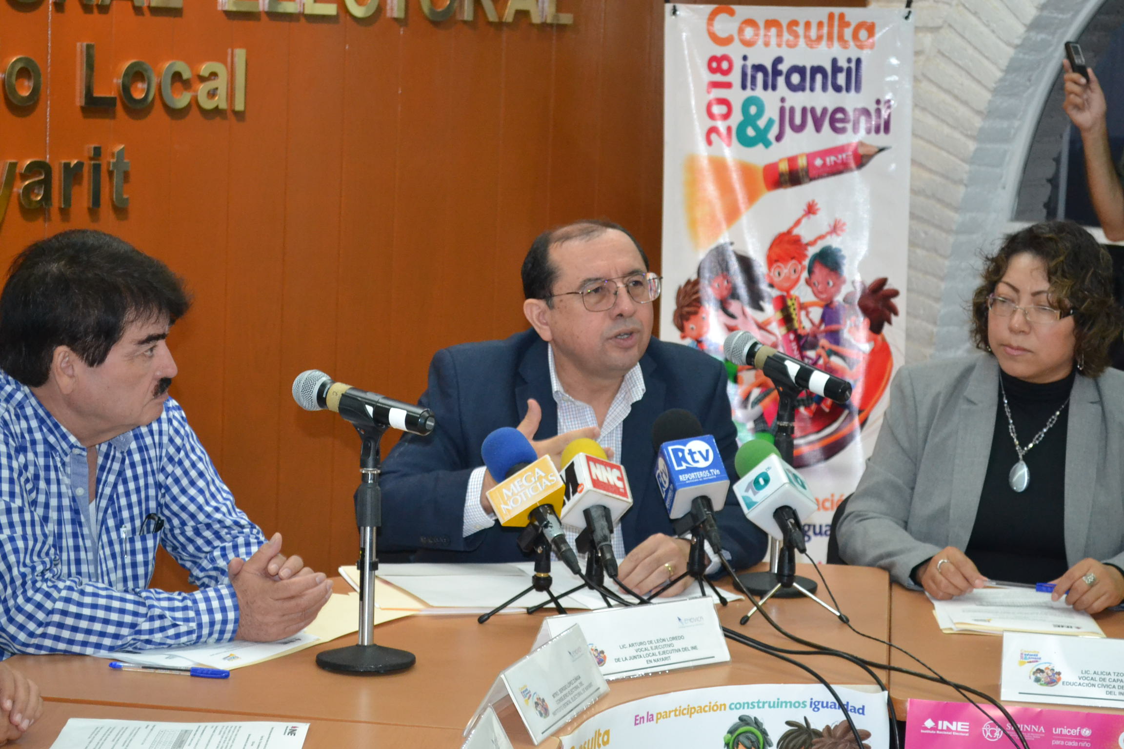 Durante la conferencia de prensa el Delegado del INE estuvo acompañado por la Vocal de Capacitación Electoral y Educación Cívica de la Junta Local del INE en el estado, Lic. Alicia Tzontecomani Mendieta; así como por los representantes del IEEN, SIPINA, SEPEN, CDI, CONAFE y de la Comisión de Derechos Humanos para el Estado de Nayarit.