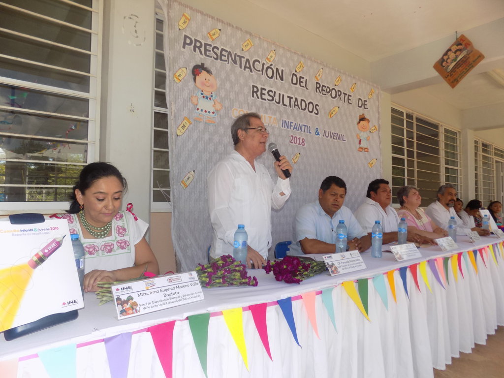 El Instituto Nacional Electoral (INE) a través de la 01 Junta Distrital Ejecutiva, entregó los Resultados de la Consulta Infantil y Juvenil 2018 al plantel 001 del Bachillerato Intercultural, localizado en la comunidad maya de Popolá, municipio de Valladolid.