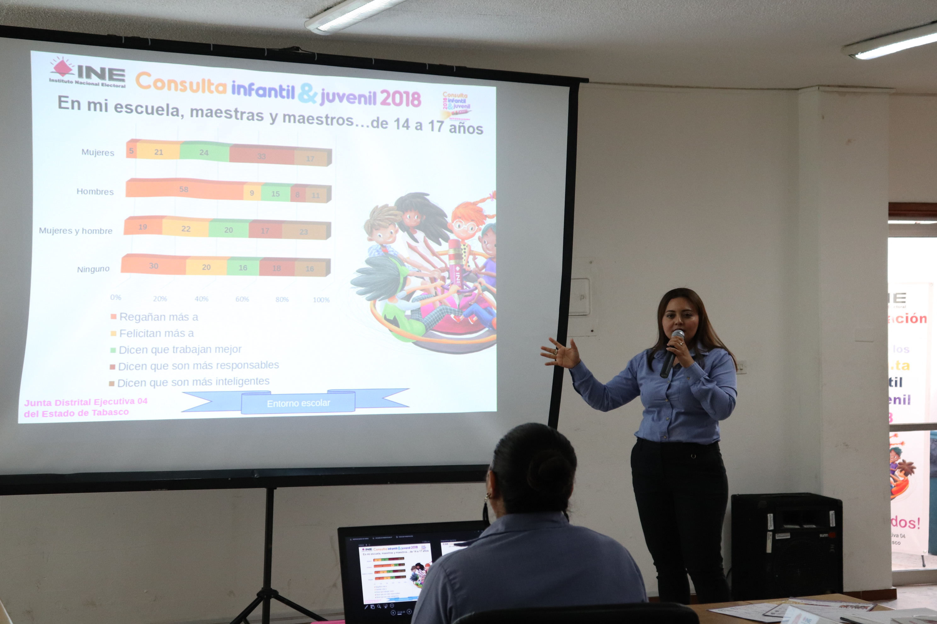 En la presentación de la 04 Junta Distrital Ejecutiva a cargo del Vocal Ejecutivo, Rey David Zarate Santiago y de la Vocal de Capacitación Electoral y Educación Cívica, Maritza Domínguez Caamaño, estuvo presente la Vocal Ejecutiva, María Elena Cornejo Esparza, quién manifestó que la difusión de estos datos estadísticos tiene como objetivo la generación de políticas públicas por parte de las dependencias involucradas en los temas infantiles y juveniles.