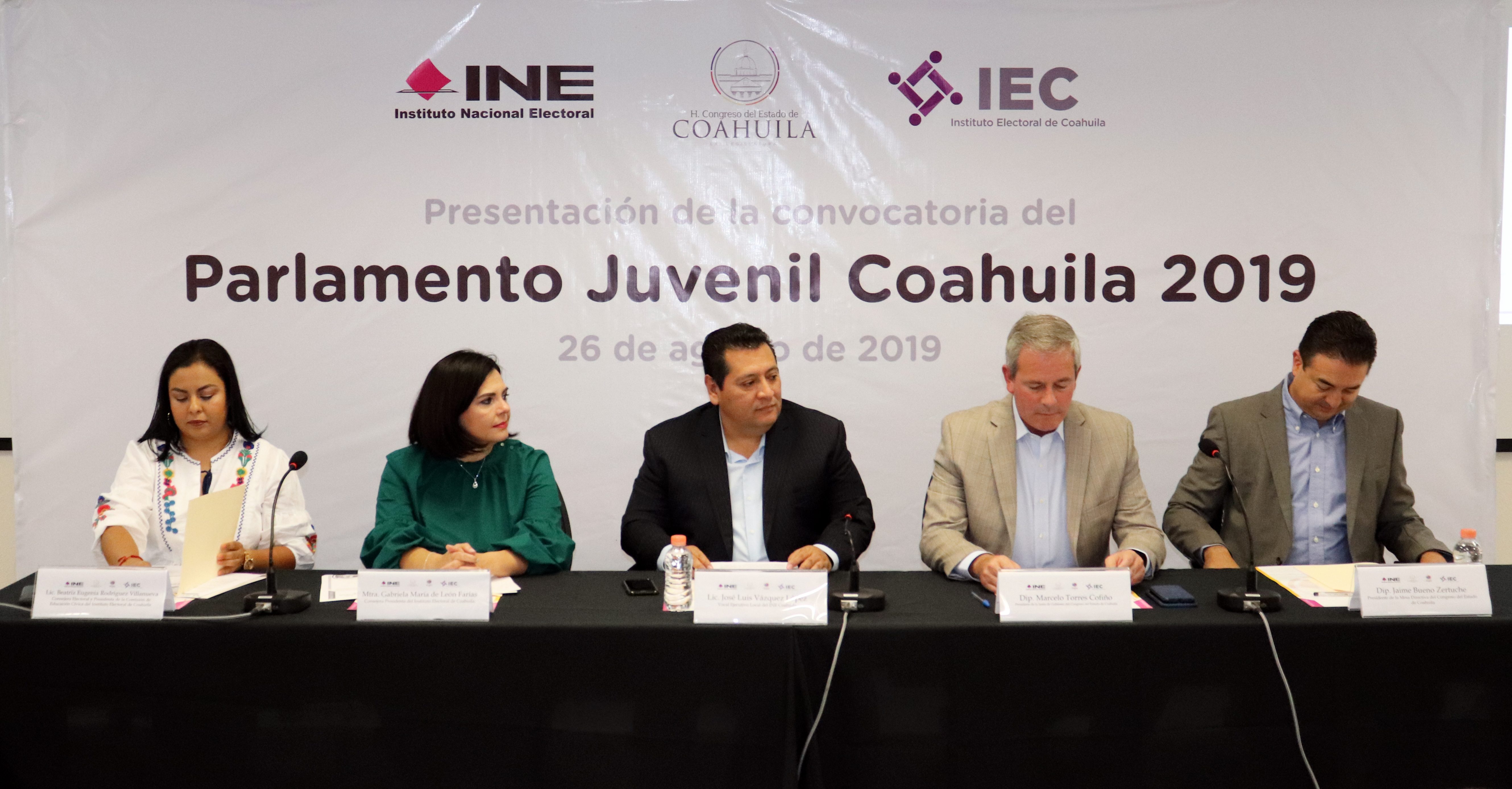 El Instituto Nacional Electoral (INE) en Coahuila, la LXI Legislatura del Congreso del Estado y el Instituto Electoral de Coahuila (IEEC) presentaron este lunes la Convocatoria del Parlamento Juvenil Coahuila 2019, el cual tiene como objetivo promover espacios de participación ciudadana para las y los jóvenes coahuilenses, en los cuales puedan manifestar sus ideas y propuestas en torno a temas de relevancia pública; así como conocer las funciones y atribuciones que desempeñan las y los diputados locales.