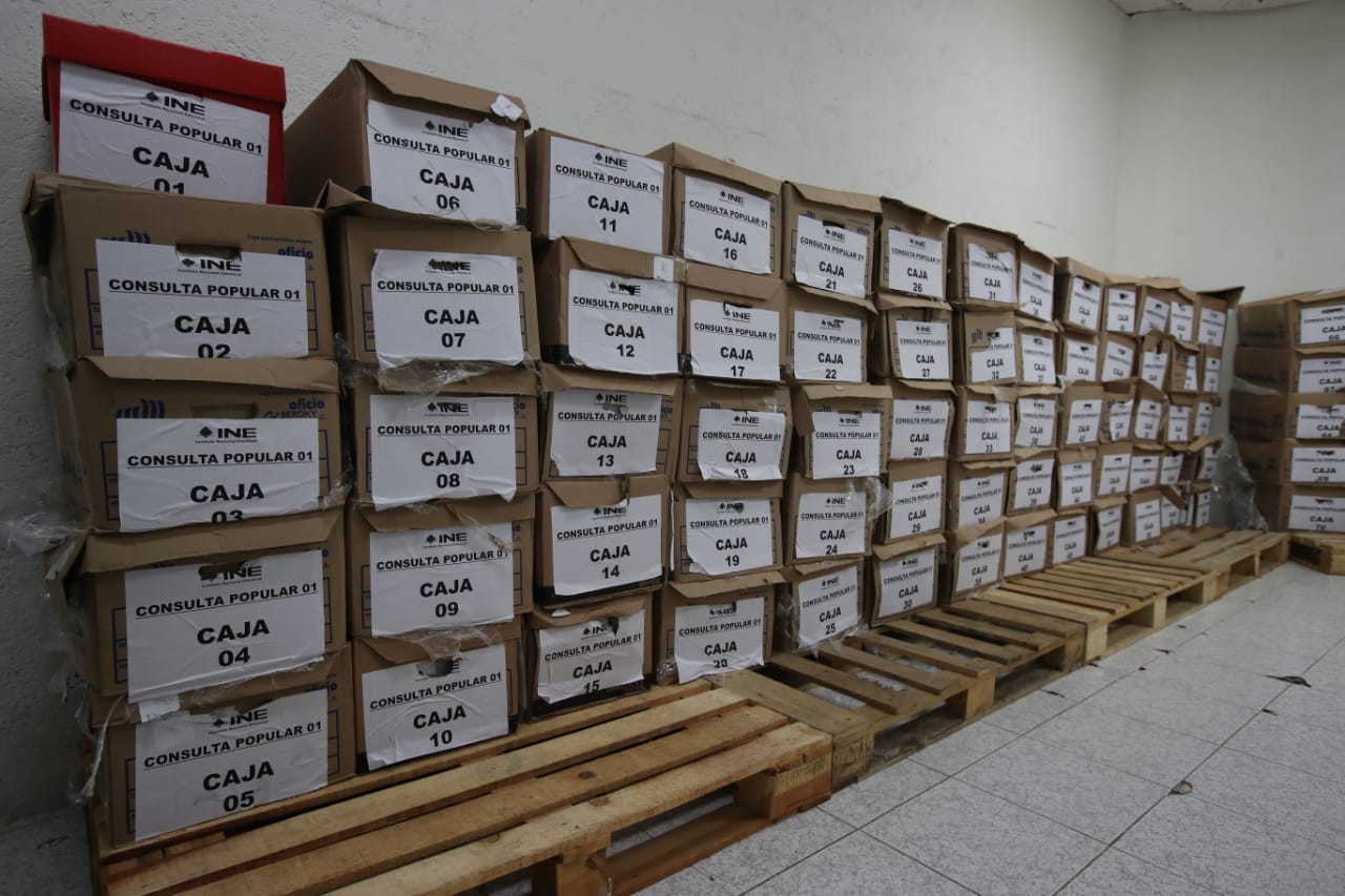 El INE resguarda las cajas recibidas por parte del Senado con los formatos de apoyo a dos consultas ciudadanas.