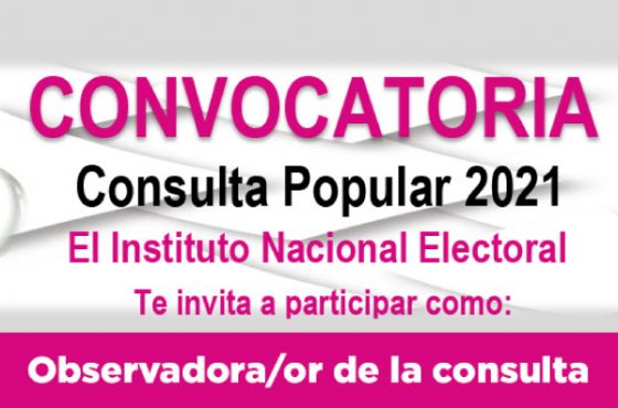 Conoce más aquí: Las ciudadanas y ciudadanos que fueron acreditados como observadores electorales en las elecciones del 6 de junio, pueden realizar observación en la Consulta Popular del 1 de agosto. Para ello, deben ratificar su intención ante las Juntas Locales y Distritales del Instituto hasta el 15 de julio de 2021.