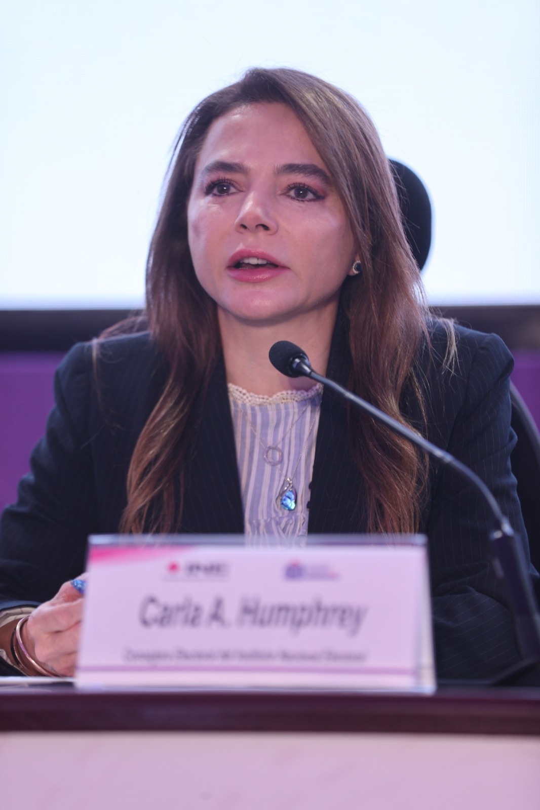 Carla Humphrey Jordan, Consejera Electoral y Presidenta de la Comisión de Fiscalización en su participación en la conferencia.
