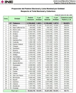 A 86 días de la jornada electoral Tabasco se encuentra en el primer lugar en cobertura del Padrón Electoral y Lista Nominal 13 marzo, 2021